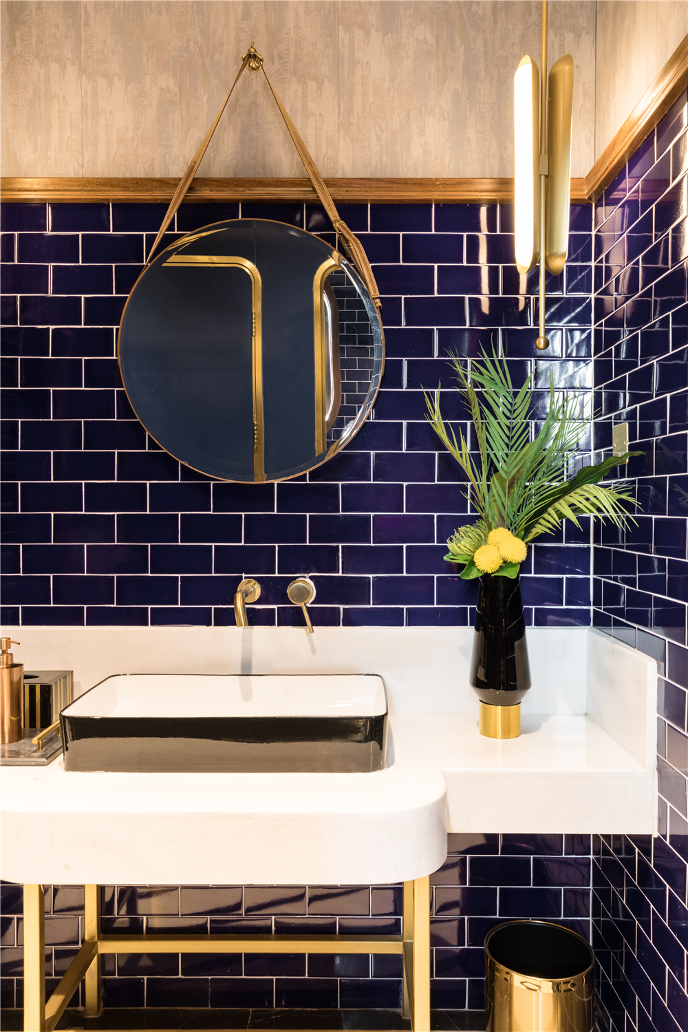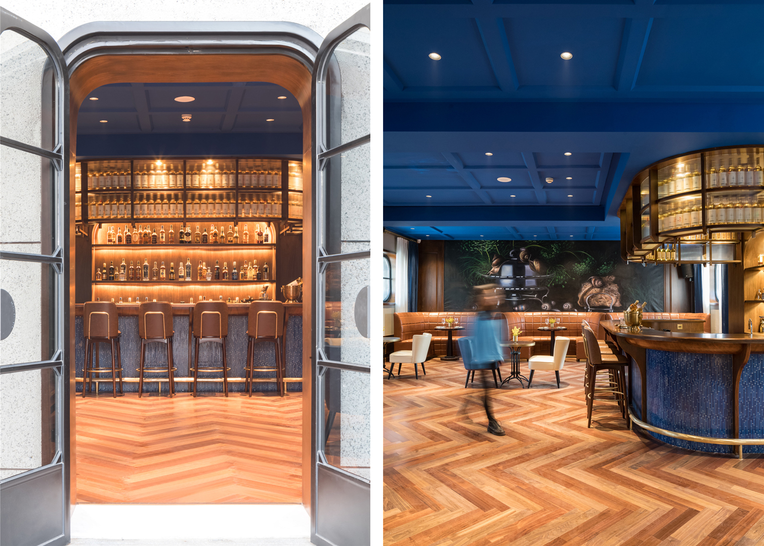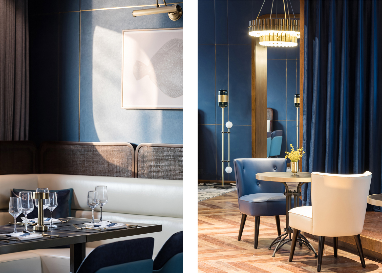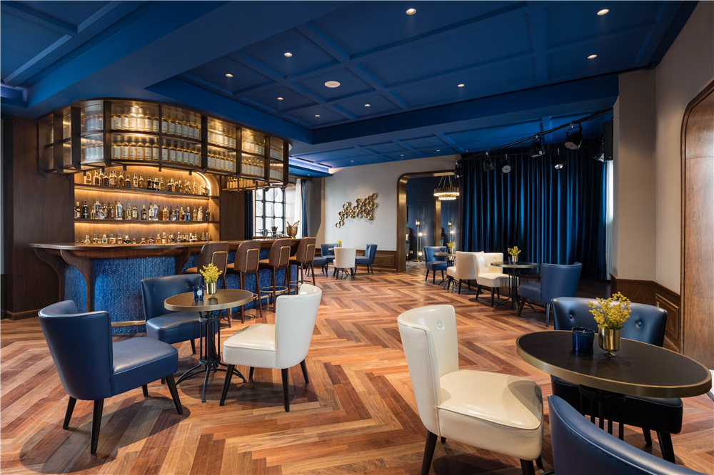 设计师在色调和材质上做了非常精妙的选择,极有年代感到海军蓝灰色调和酒瓶绿作为主体色调,同时运用木质材料,辅以暖色调灯光加以修饰,重塑旧日时光却又历久弥新。