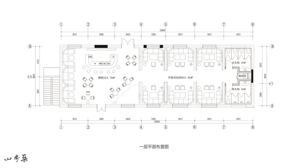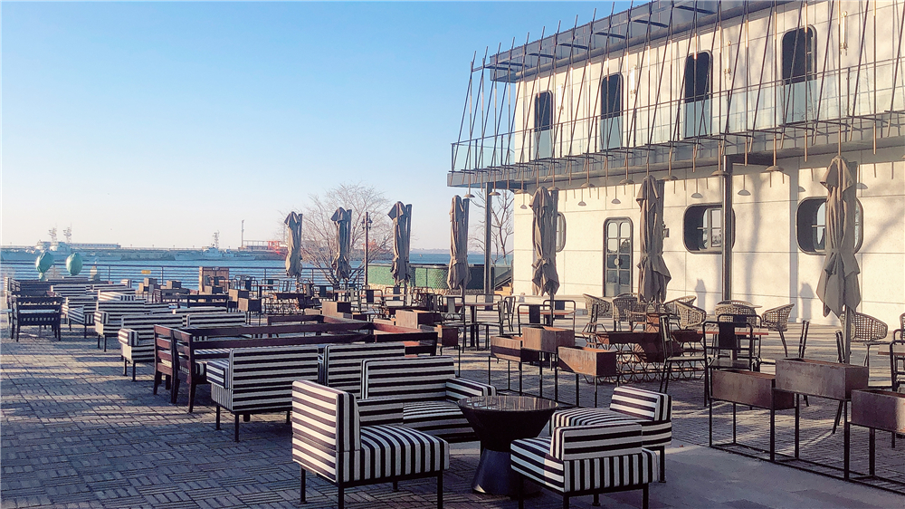 进入酒吧是一个开放的公共大厅,位于中央的是吧台区,其余空间设计了半开放式和私密空间来分别满足不同的使用需求。半开放卡座区的每一个窗外完美取景了历史遗迹老船坞的景致,设计师以不同空间体量大小的变化来丰富酒吧的整体设计,空间有区隔又不失整体性。从酒吧外观到主体区域,错落有致。