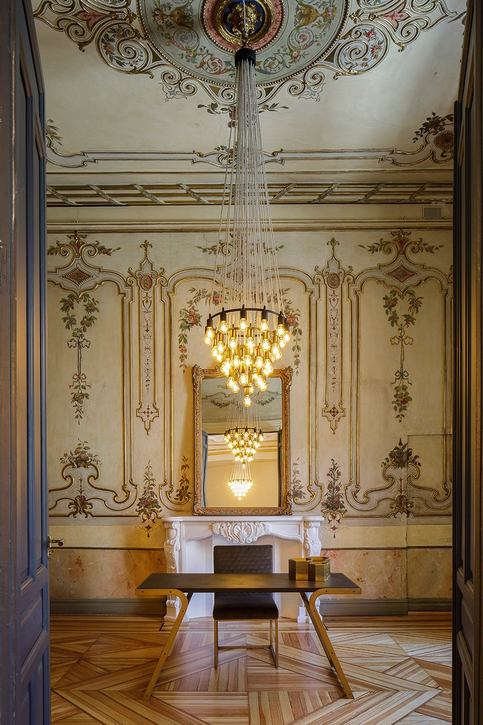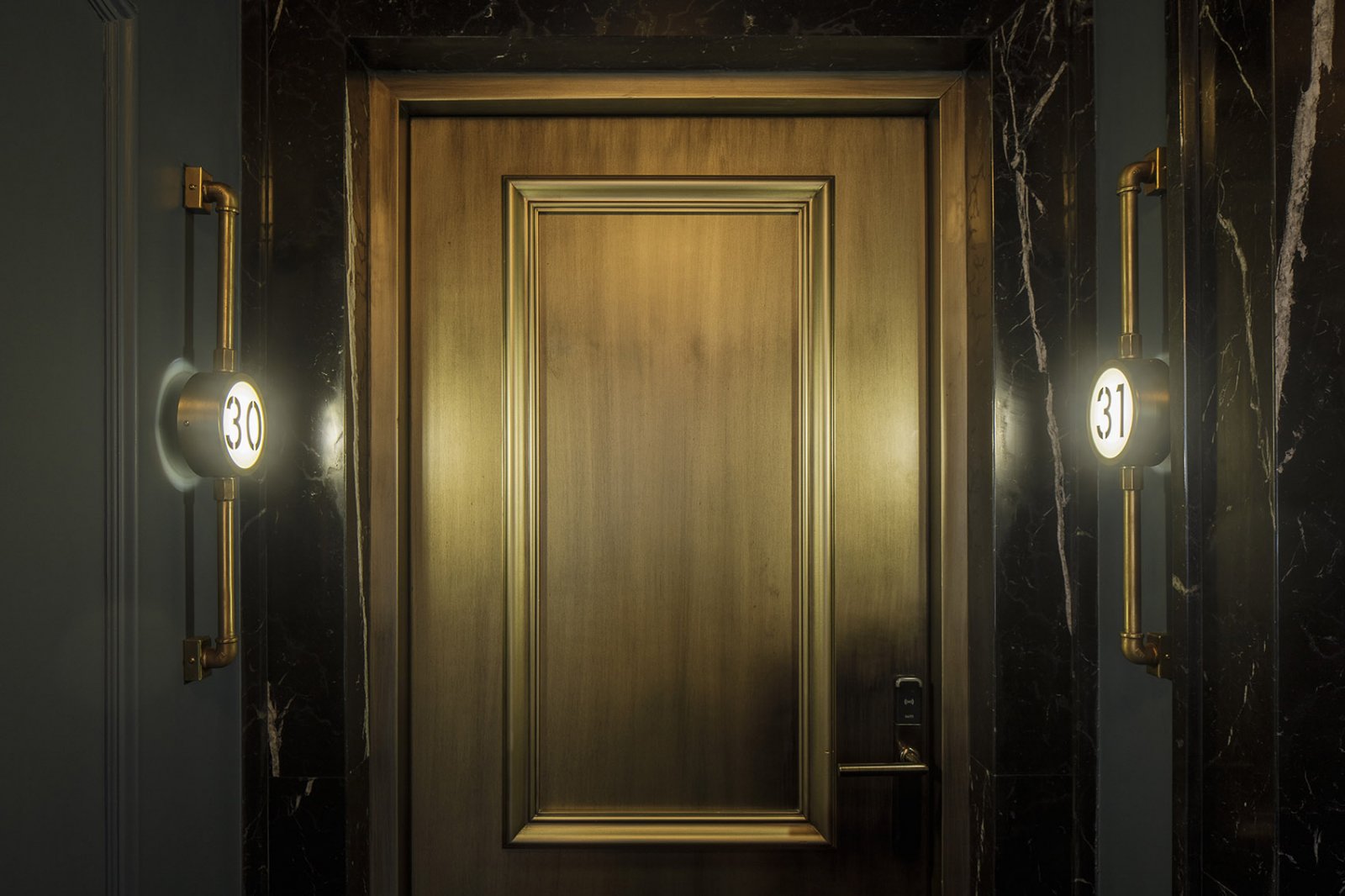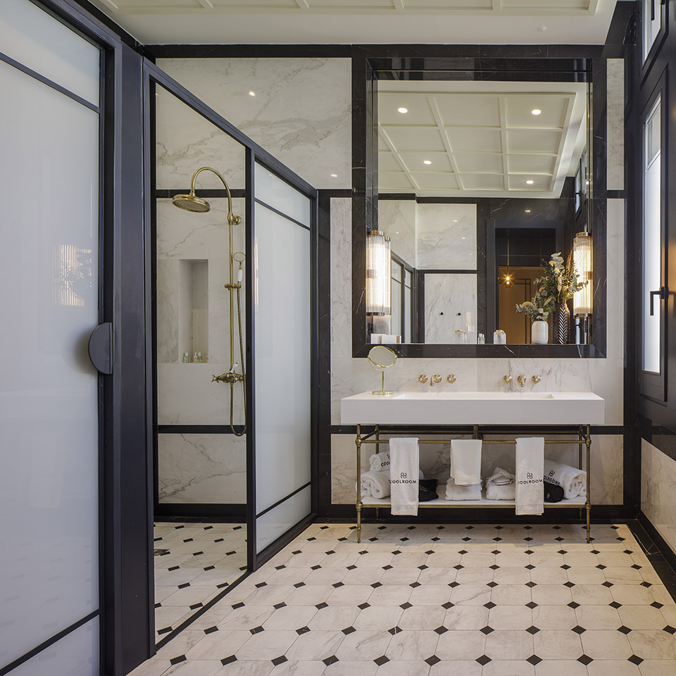 新酒店35间房间分布在5层楼的空间中,拥有5间豪华客房、8间高级客房,10间初级套房、6间普通套房、3间主套房和2间酷客房(Cool Suites)。进入房间后,客人们为房间的尺度和细节所惊叹。房间内配备有舒适精致的家具,床由一个大型床头板支撑,可以与衣柜组合在一起。在床的两侧,散发温暖光线的纸质灯具搭配着黄铜细节。▼客房入口