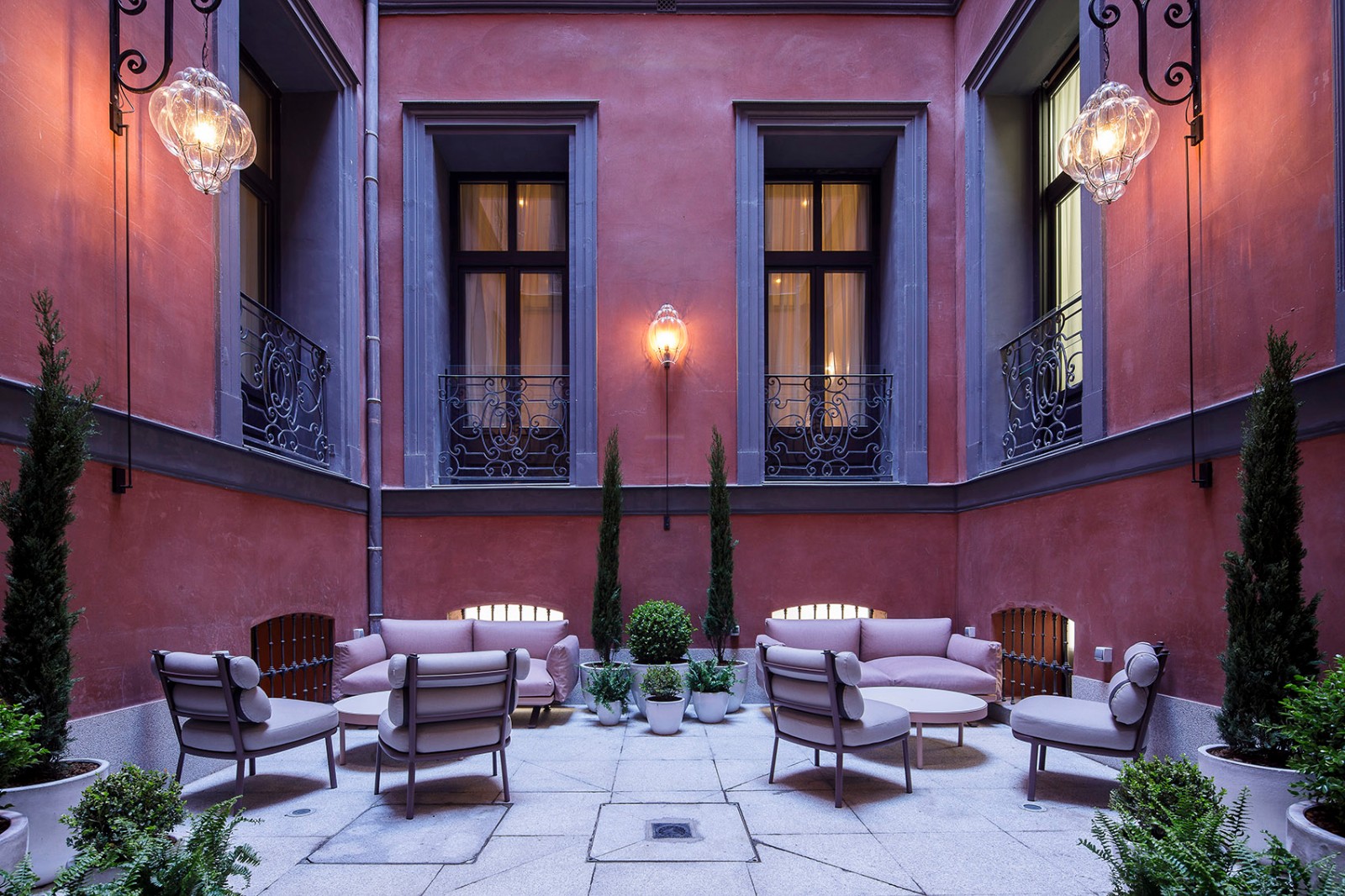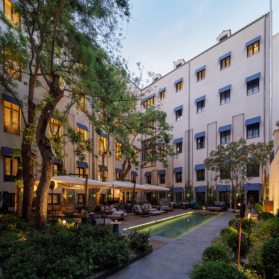 酒店内设有大面积的公共区域,内部庭院成为中心舞台,客人可以在这里享用一个带有泳池和酒吧空间的花园区域。