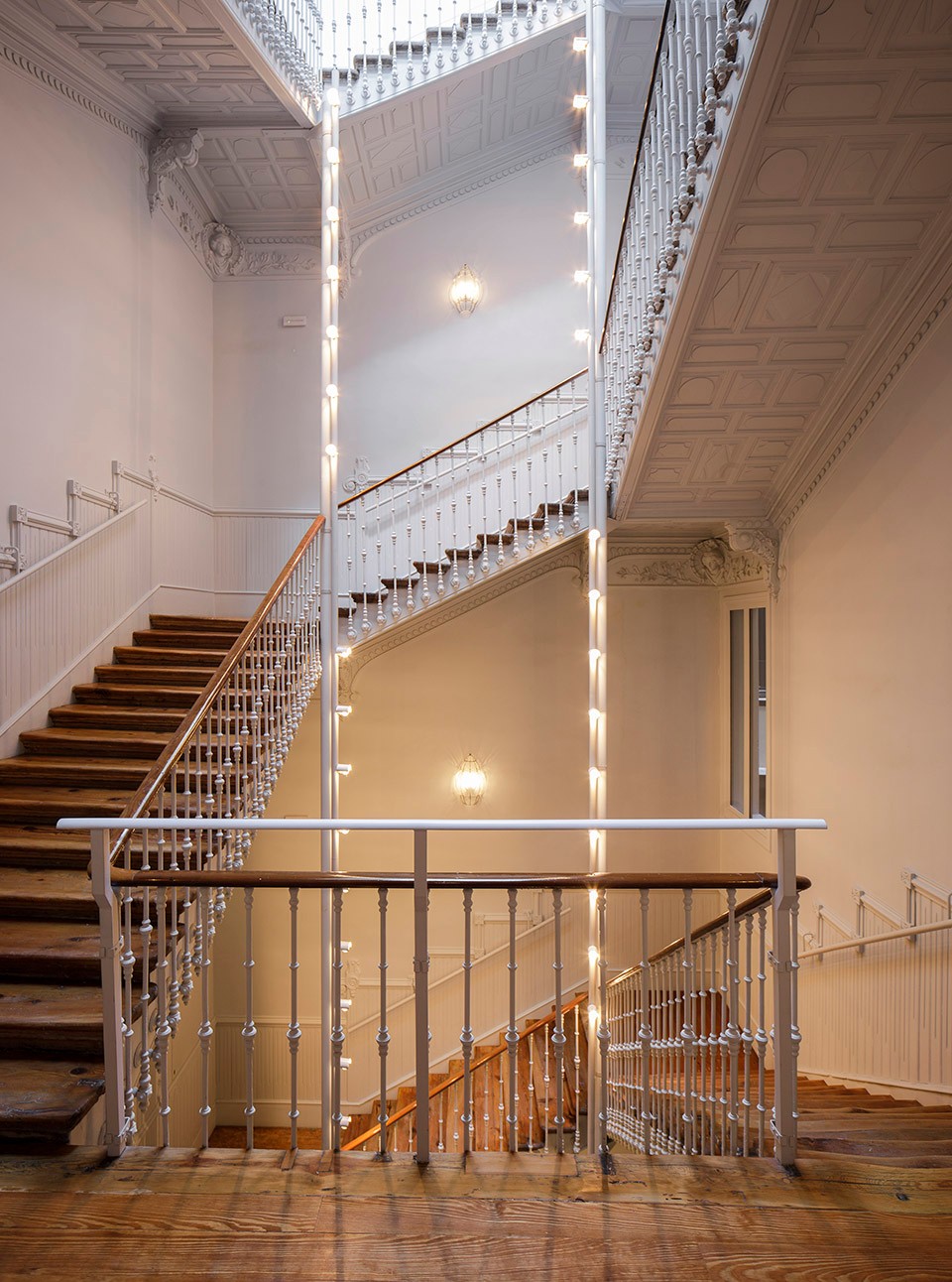 位于建筑中一个主要空间内的酒店接待处带有一部改造复原的大型楼梯,顶部一扇天窗引入自然光线。这种垂直照明方式进一步强调和凸显了楼梯的高度。
