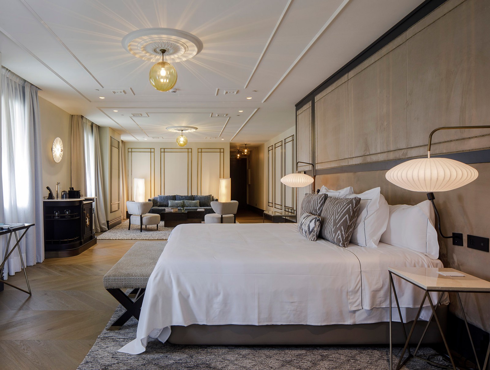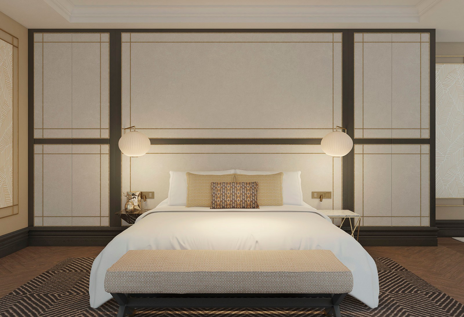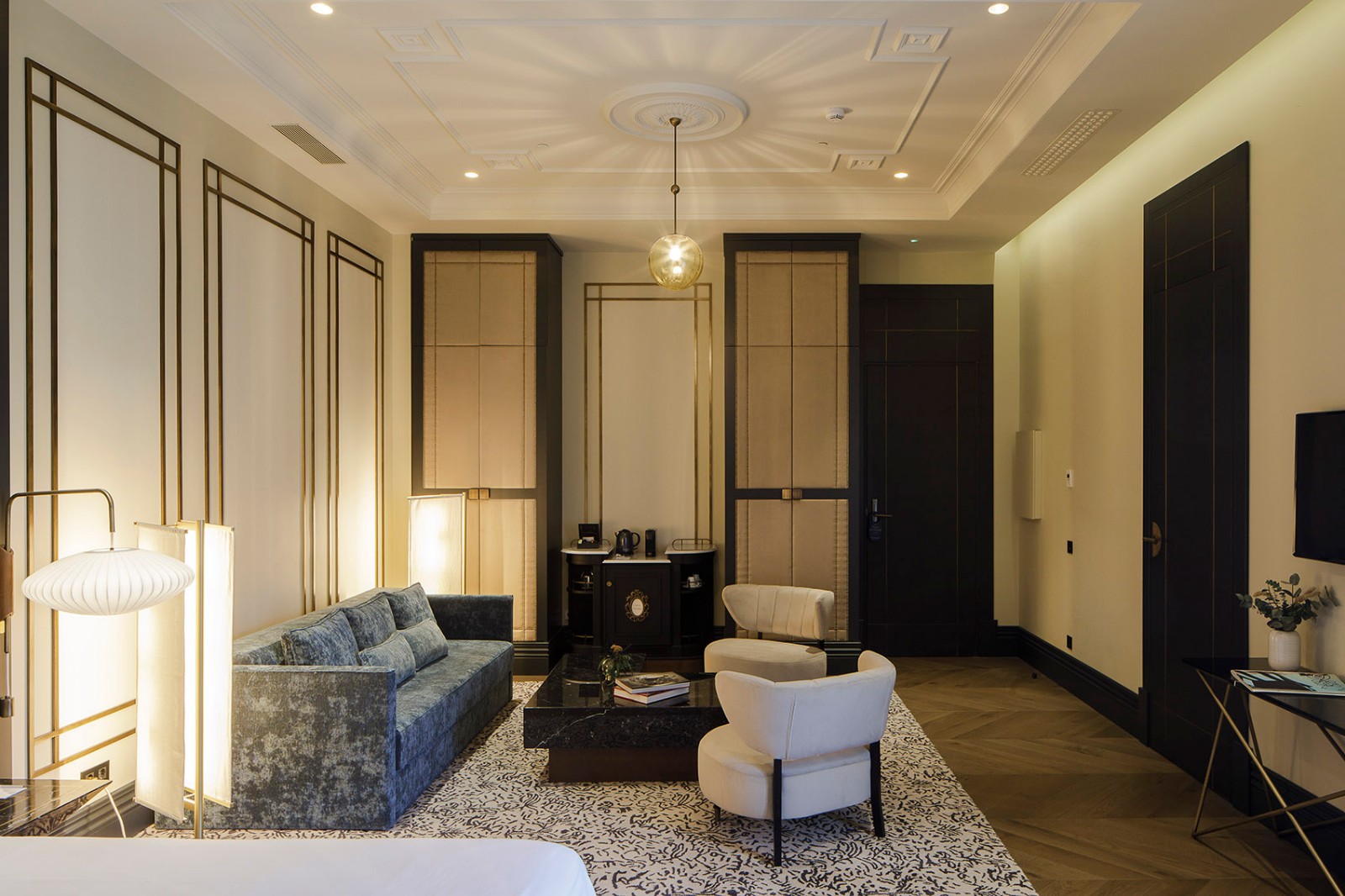 浴室也遵循同样的方式处理、关注和强调细节。木质地板和装饰性的线脚和墙纸为房间带来了与众不同的温暖感,让客人在这些大面积的空间中也能有一种宾至如归的感受。所有的一切让酒店成为一个像家一样舒适的空间,塑造了一种无与伦比的入住体验。▼木质地板和装饰性的线脚和墙纸为房间带来了与众不同的温暖感