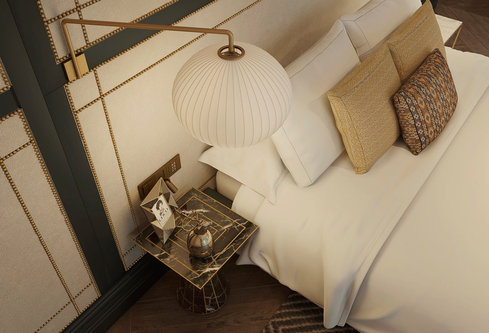 ▼在床的两侧,散发温暖光线的纸质灯具搭配着黄铜细节