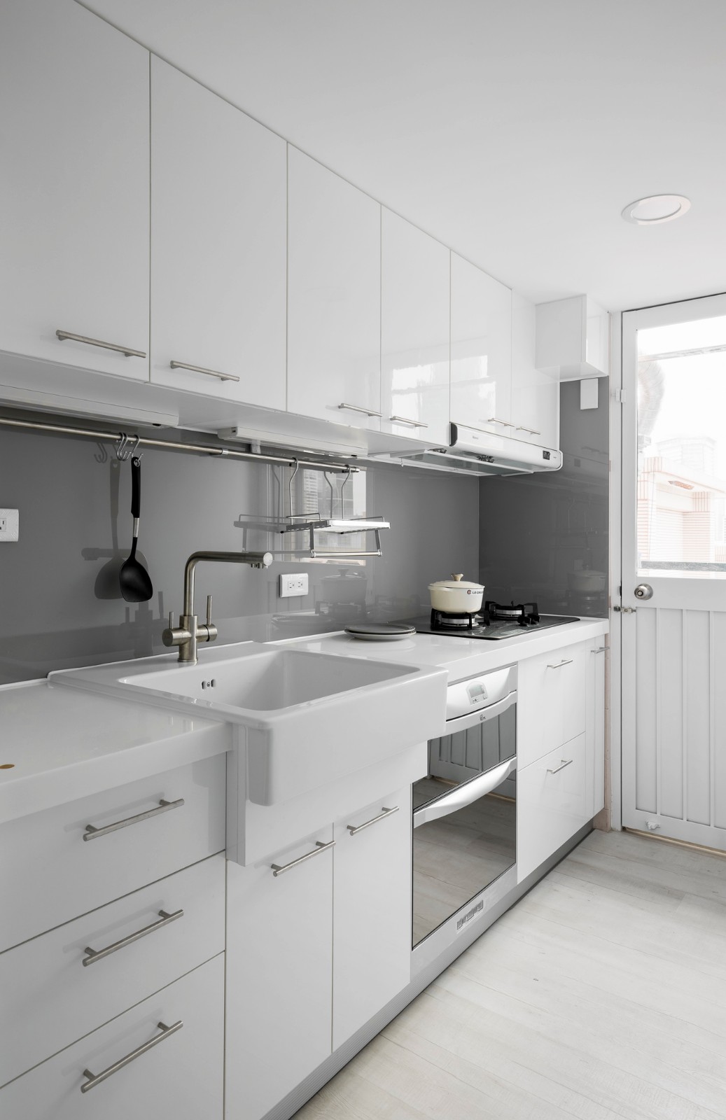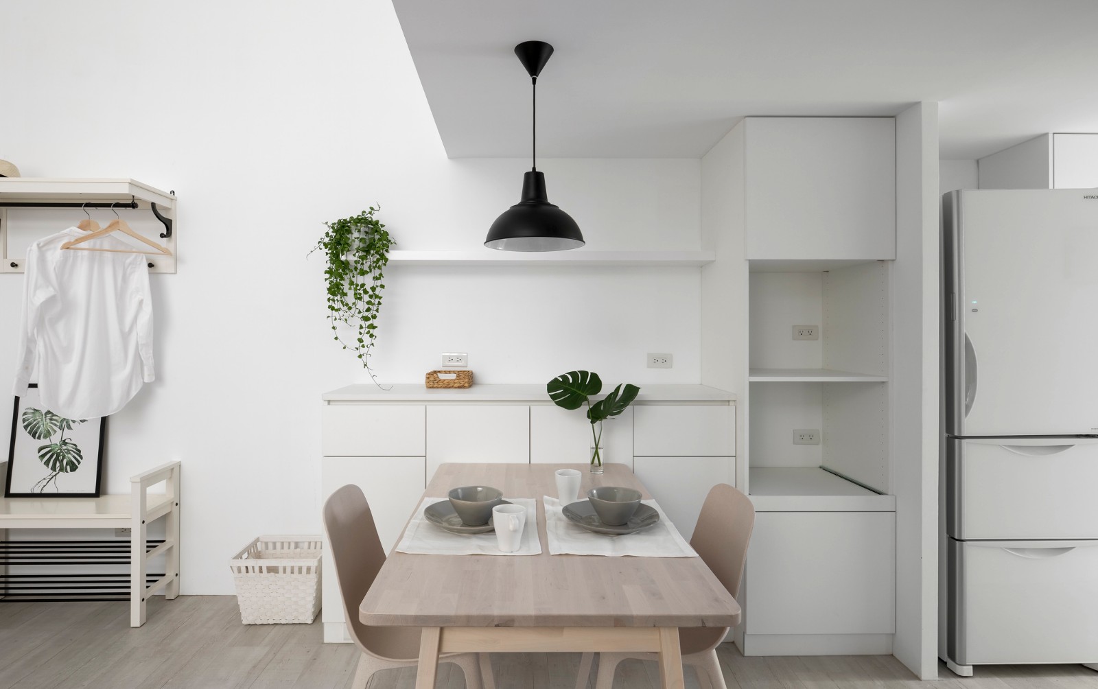 在白的极致中,浅色系物件沉潜其中,安定、温馨的氛围包覆着屋内的人们,偶有深色点缀,更立体了画面。窗边的卧榻依着立面延伸,楼梯侧的卧榻刻意制造了高低差,衔接为梯体转阶,透过设计让卧榻不仅能收纳物品、坐卧休憩,还延伸为踏阶使用。