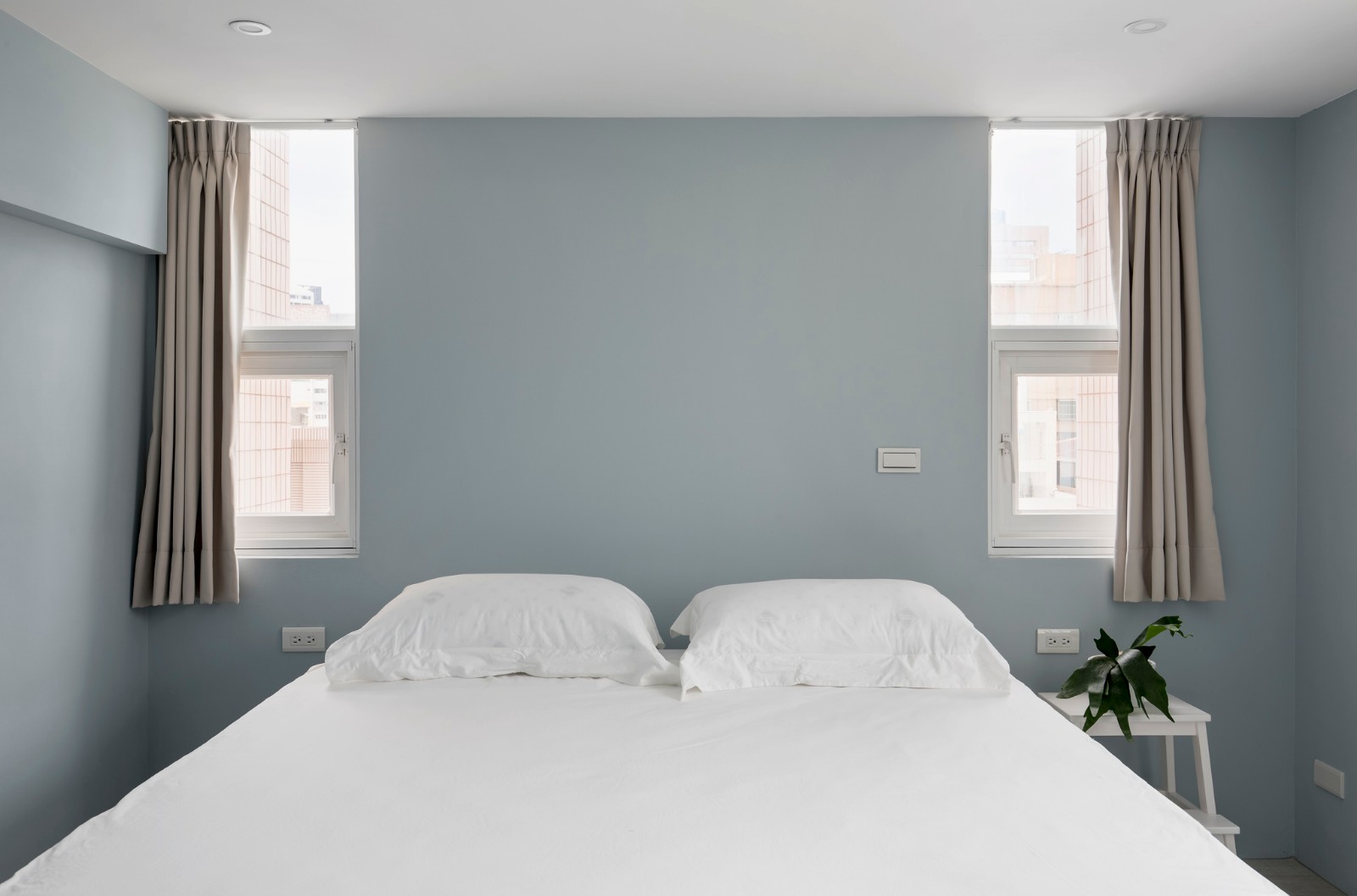 主卧室维持一贯的简洁,倒是在立面给予了别致的淡色蓝,以低彩度衬托空间中的人物。善用大面开窗优势,创造更大的空间感,交织着阳光与生活细节,生活美学并不如字面上遥不可触,而是人人皆可享有的日常抒情。