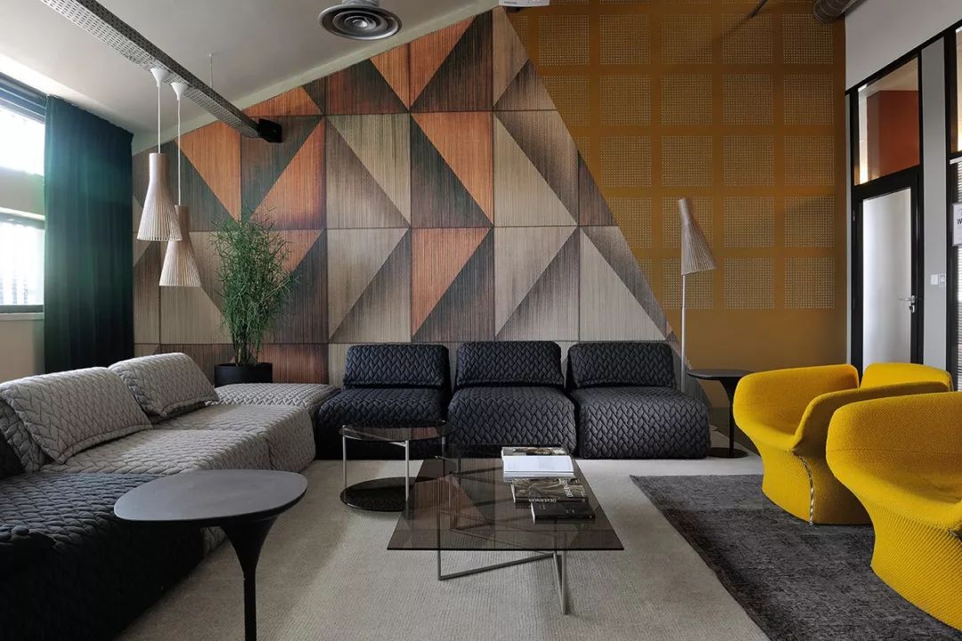 不同家具的高低错落组合,不同几何元素及颜色的混搭,创造出灵活的空间层次及视觉效果。