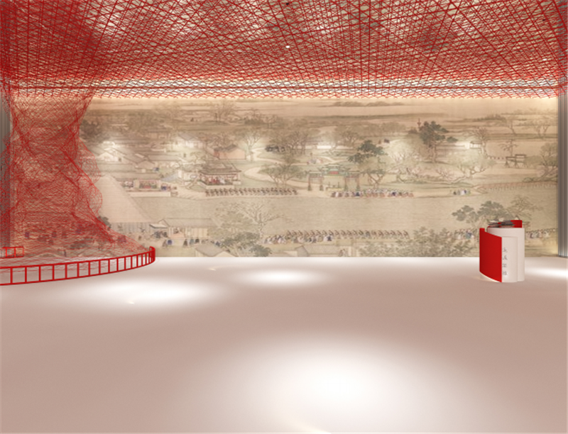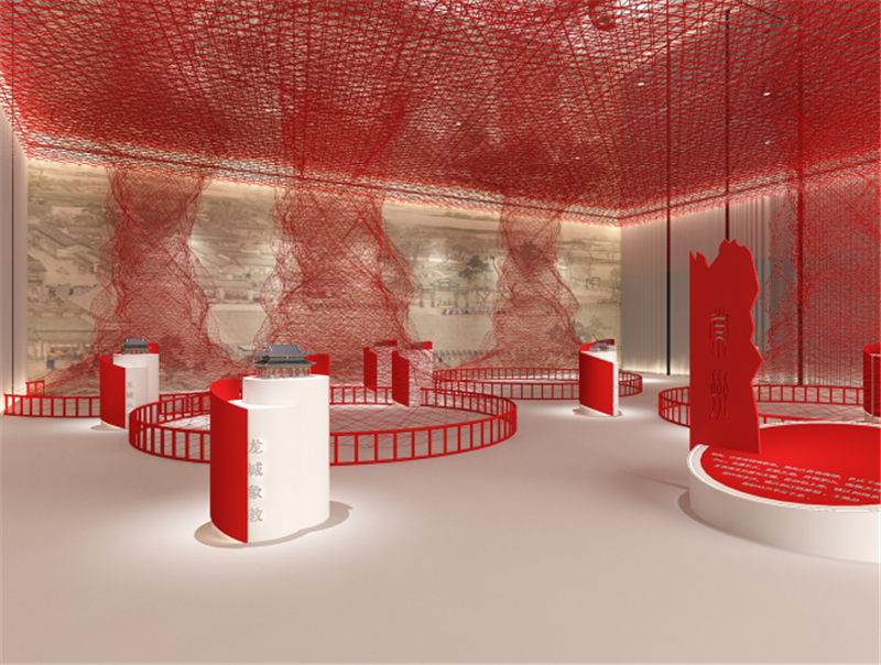 常州城市形象设计展区,以清朝乾隆帝巡视江南在常州天宁寺拈香礼佛御笔亲题的“龙城象教” 匾额为主题元素,以红色为主色调,糅合古代城市繁华意象,呈现常州独特的城市精神。