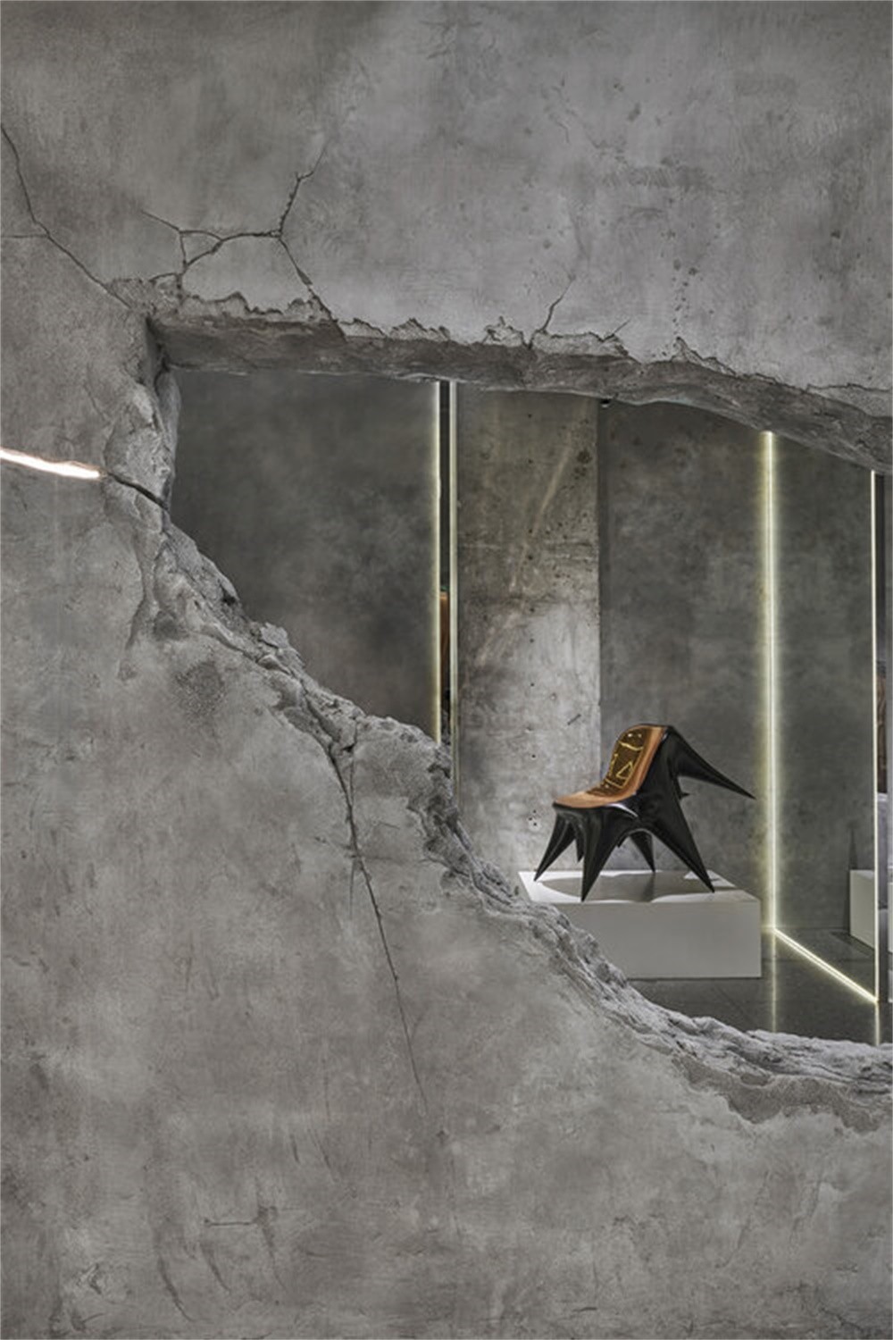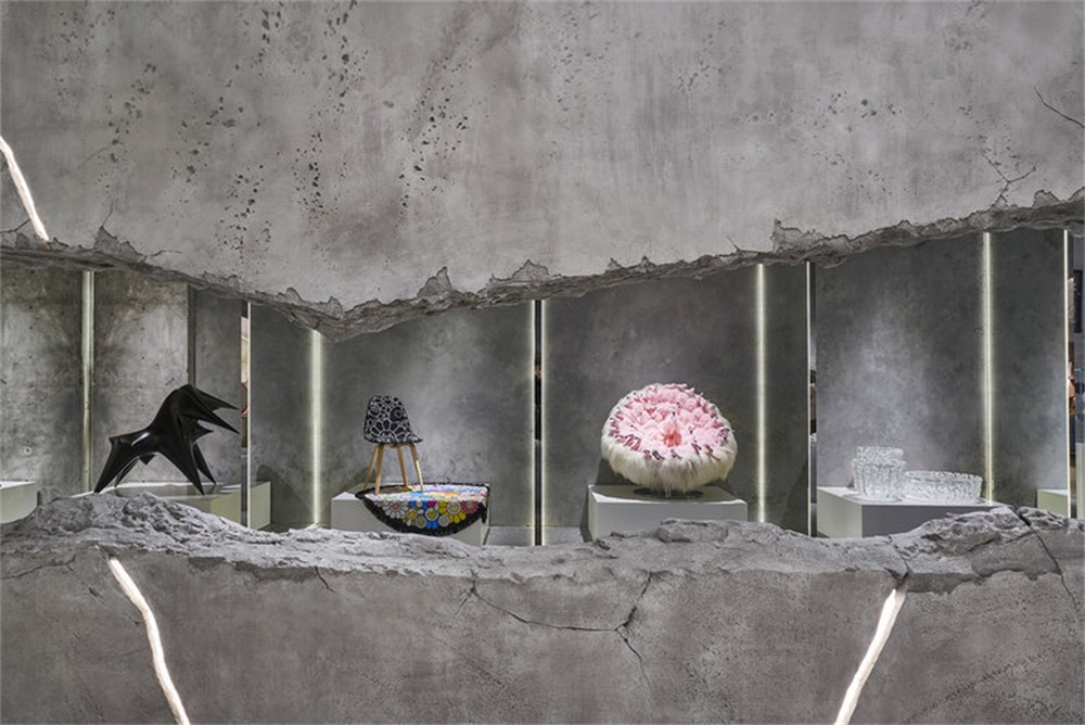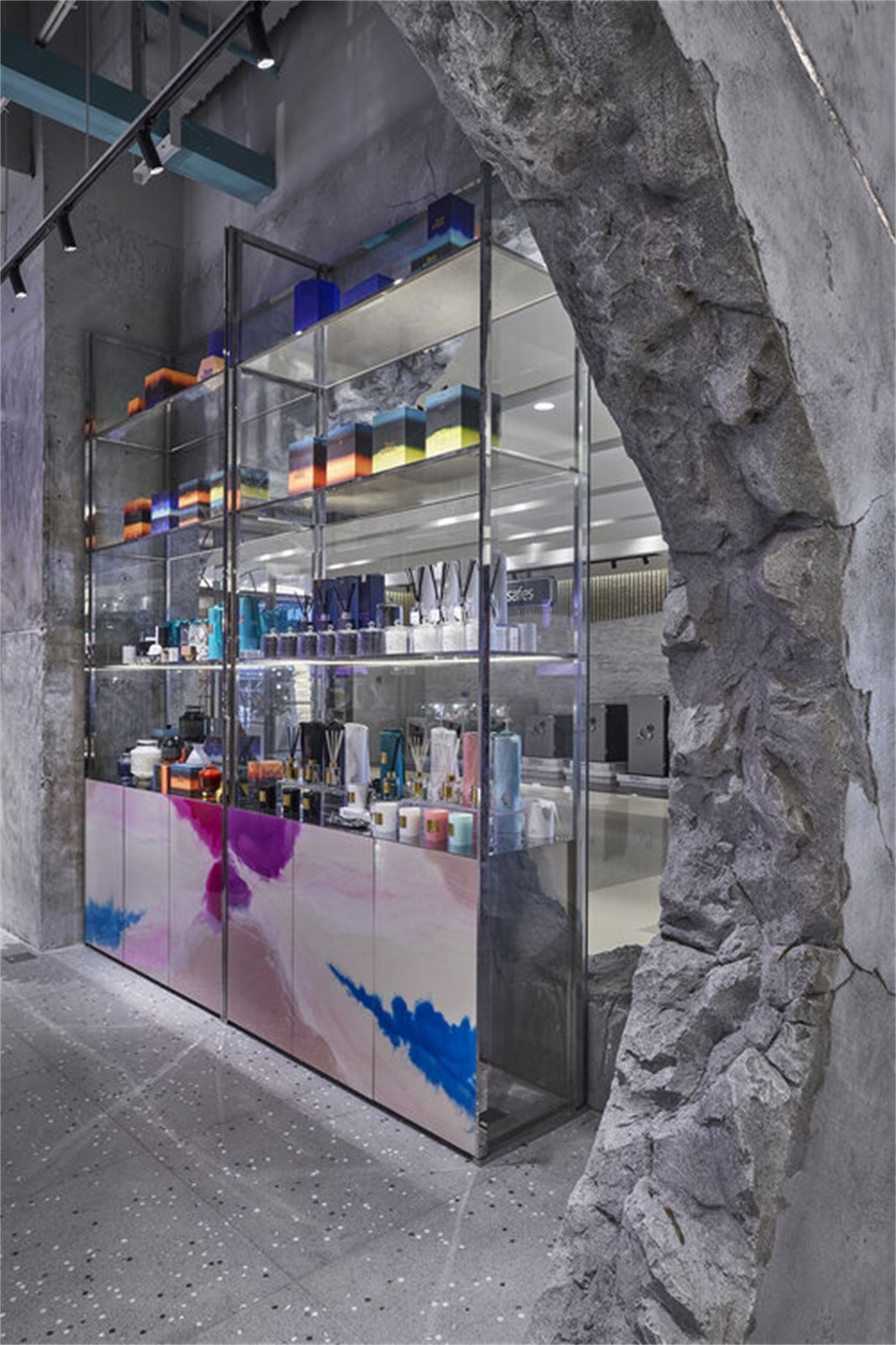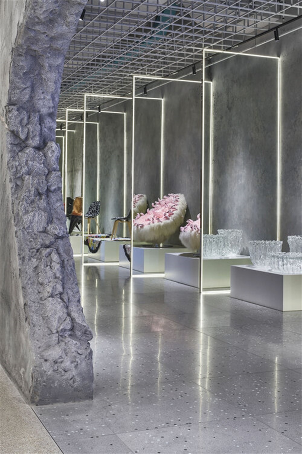 立面巨大的混凝土墙壁上的裂缝和孔洞部分暴露了250平方米的室内空间,购物者可以在这里自由地通过各个入口和出口流通。在一些区域,大型玻璃柜会阻碍了通行。产品展示在空间的中心,唤起了人们对Memphis集团特有的形状和形式的关注。嵌有玻璃大理石的水磨石瓷砖和彩色树脂板有助于增加触感。