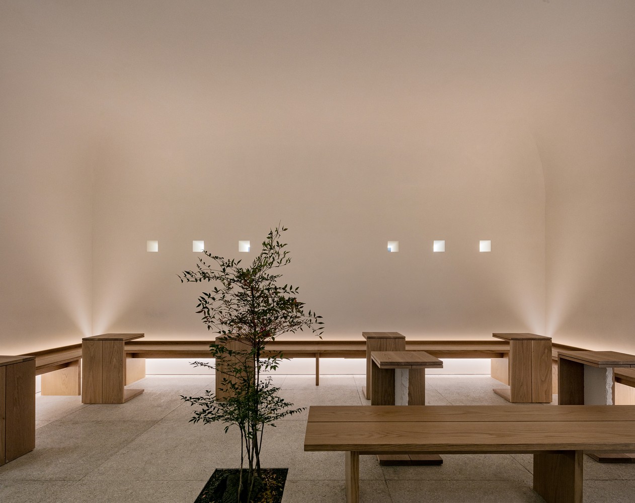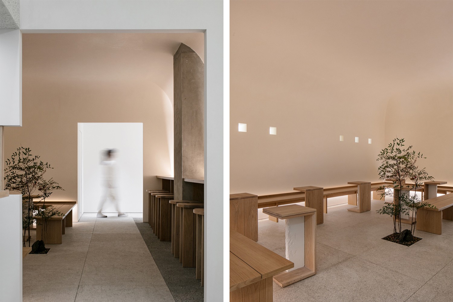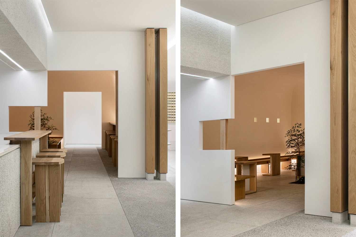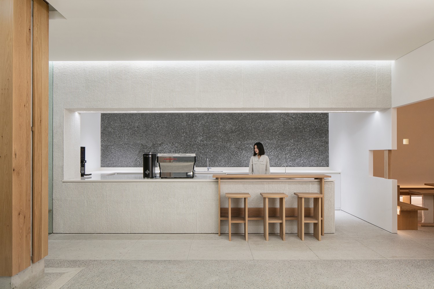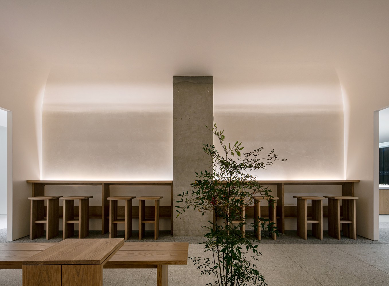 设计师在太空中放置了“Dansaekhwa”和“白色瓷器”的细微差别,以表达YUN质地的极简主义。它使设计能够从不同的眼睛和循环中体验不同事物的相互作用和共存。作为Dansaekhwa的表达技术渗透到汉字并浸入多种颜色的一种简单而重复的语言,白光穿透了混凝土的质地并反射了空间中的光。天花板的形状是凸形的或凹形的,以便可以感受到各种空间感。