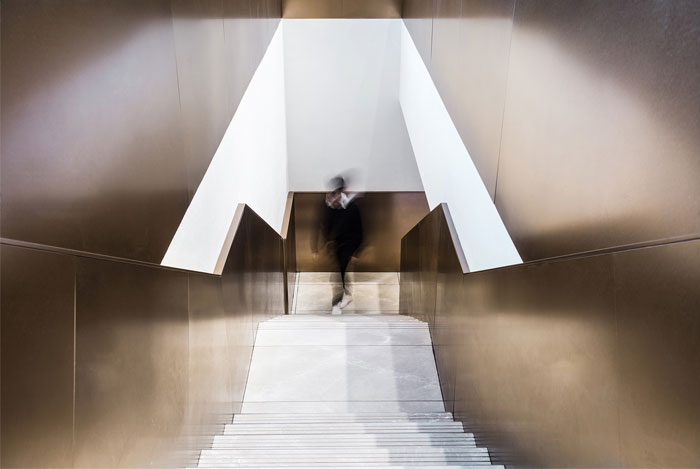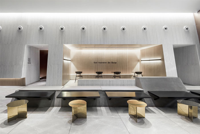 整体空间以现代几何形式,简单,朴素的材料和色调以及结合了精神和艺术风格的氛围为特色。内表面的大面积覆盖着混凝土和金色不锈钢,呈现出强烈的质感对比。黑色烤漆应用于细节,有助于平衡并为空间增添现代感。此外,金不锈钢延伸到楼梯装置,在柔和的光线下显得更加灵活和动感,并成为空间中的视觉亮点。