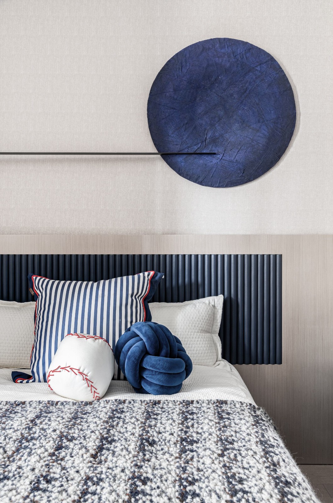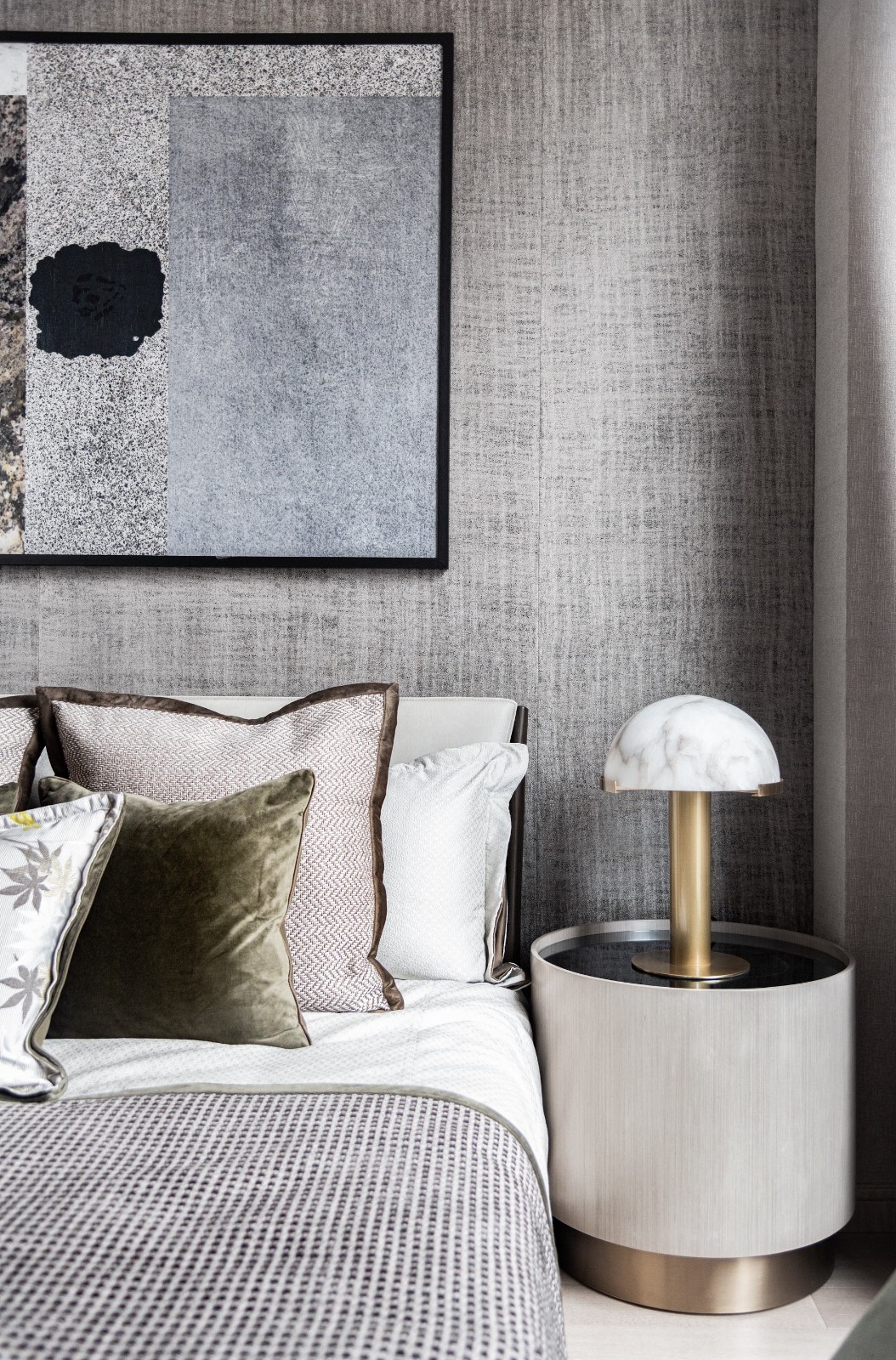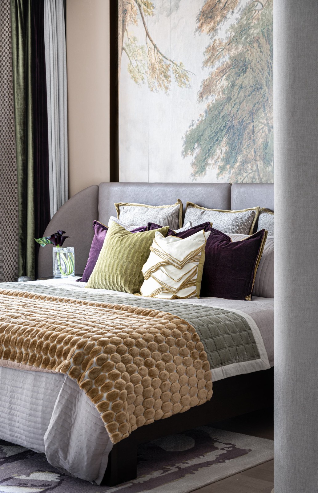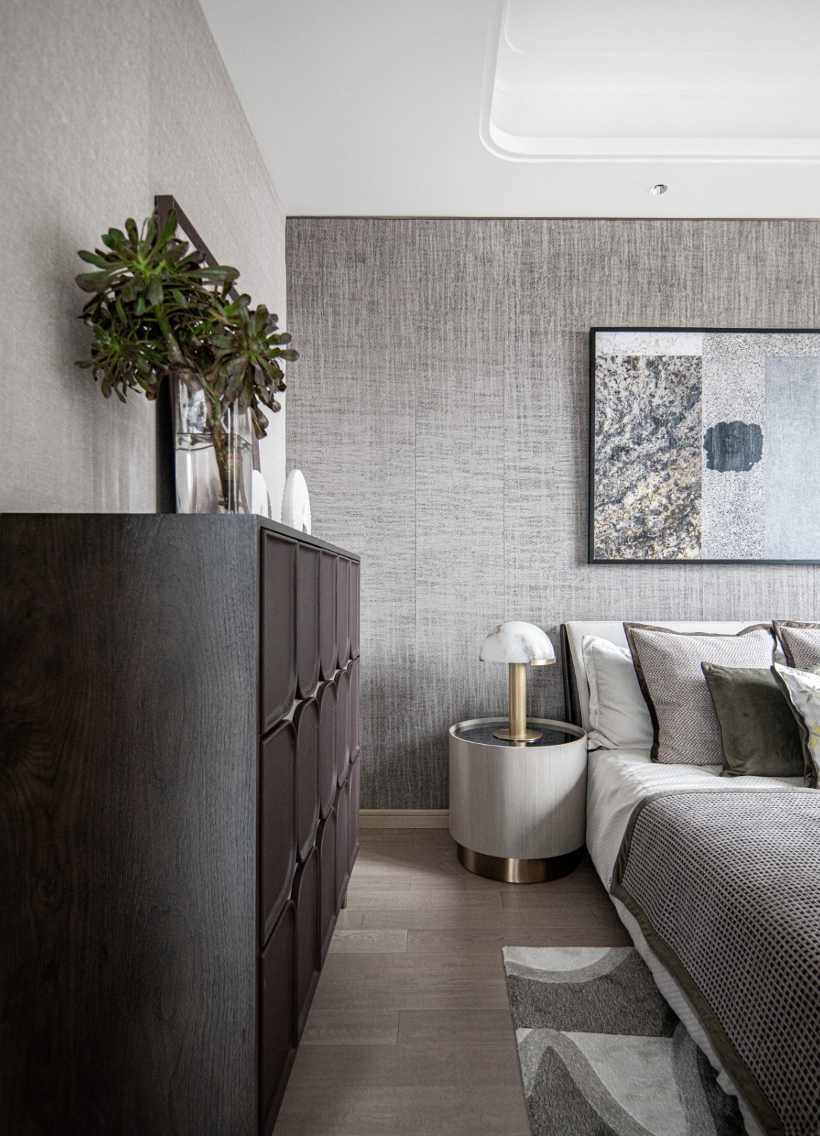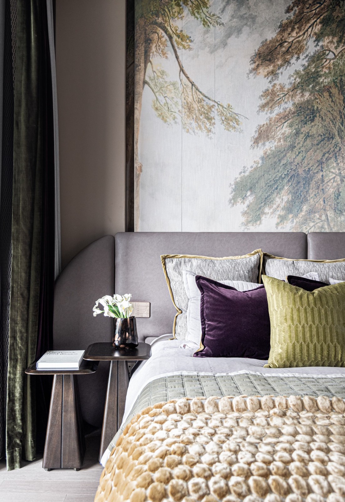 主卧主卧以松柏的绿为基调,搭配典雅紫色呈现具有品质的奢华感,丝绒,皮革,棉,毛等不同材质的对撞也丰富了我是空间的层次感,凸显了居住的舒适性。