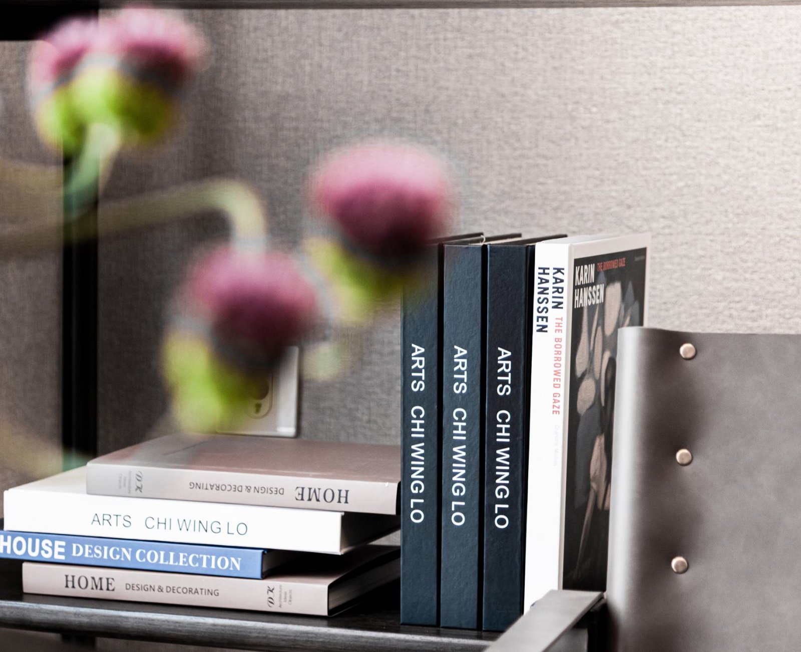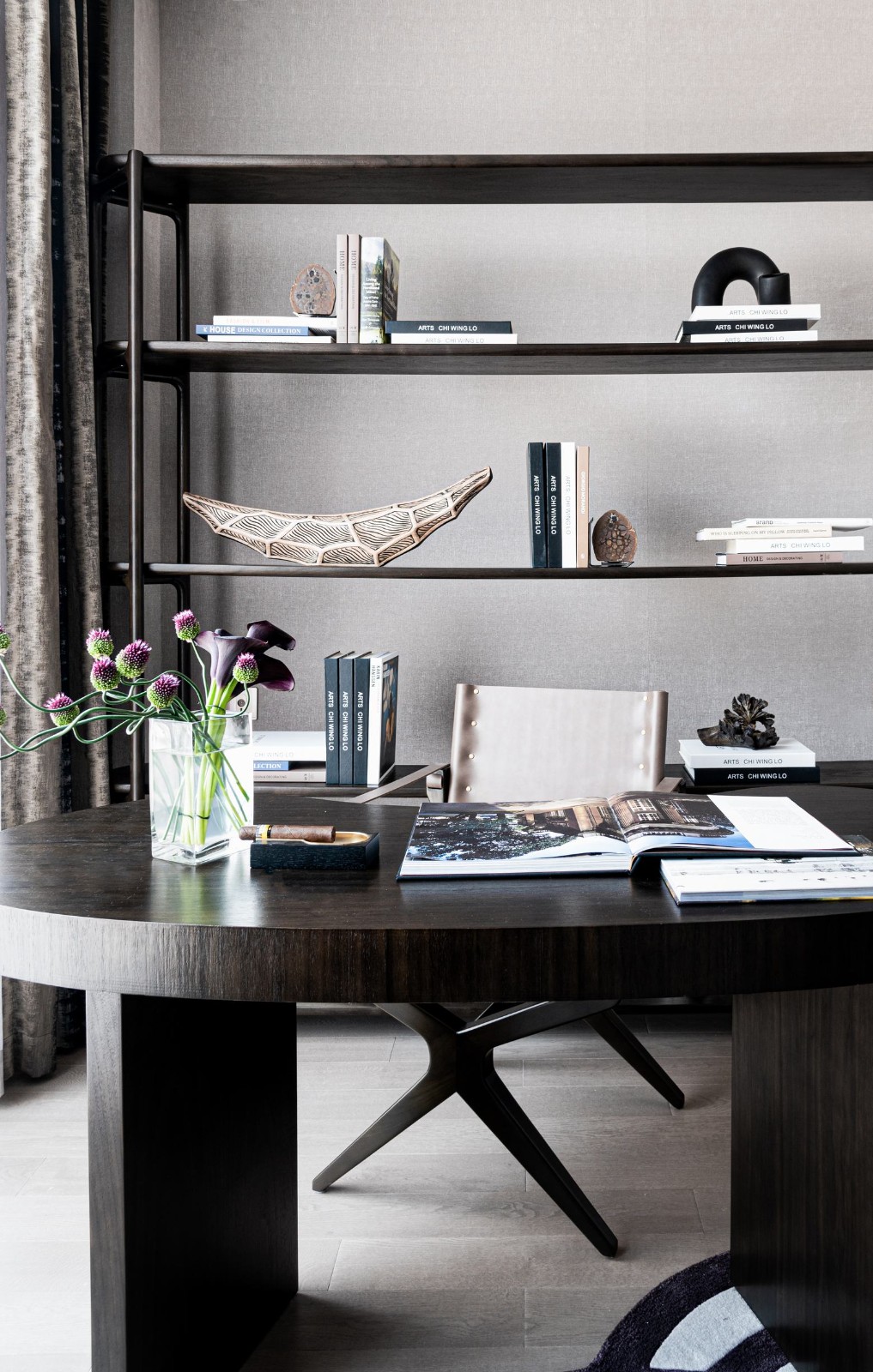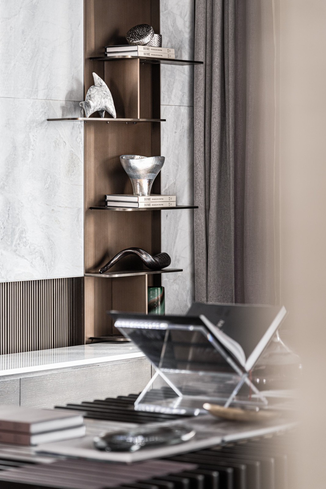 书房书桌后的透视柜既可以展现个人阅读品味,又能因透视效果,解决书房和起居空间的局促感。带来情境与功能上的变化。