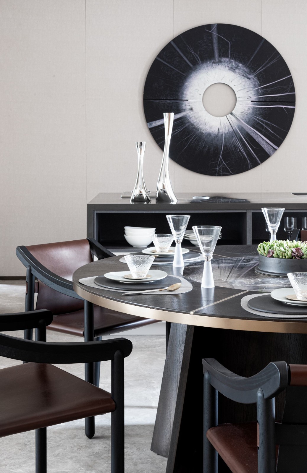 对许多人来说,料理美食是他们生活中相当重要的一部分。对于老上海而言,饭桌与牌桌上更是家族交流与社交的重要舞台。传统海派的木质圆桌做为中心点,极具礼仪感,座椅与灯具在视觉上呈现一个圆融的弧度。加上现代艺术精品做点缀,中西结合的冲突之美也就成为最令人醉心的魅力所在。