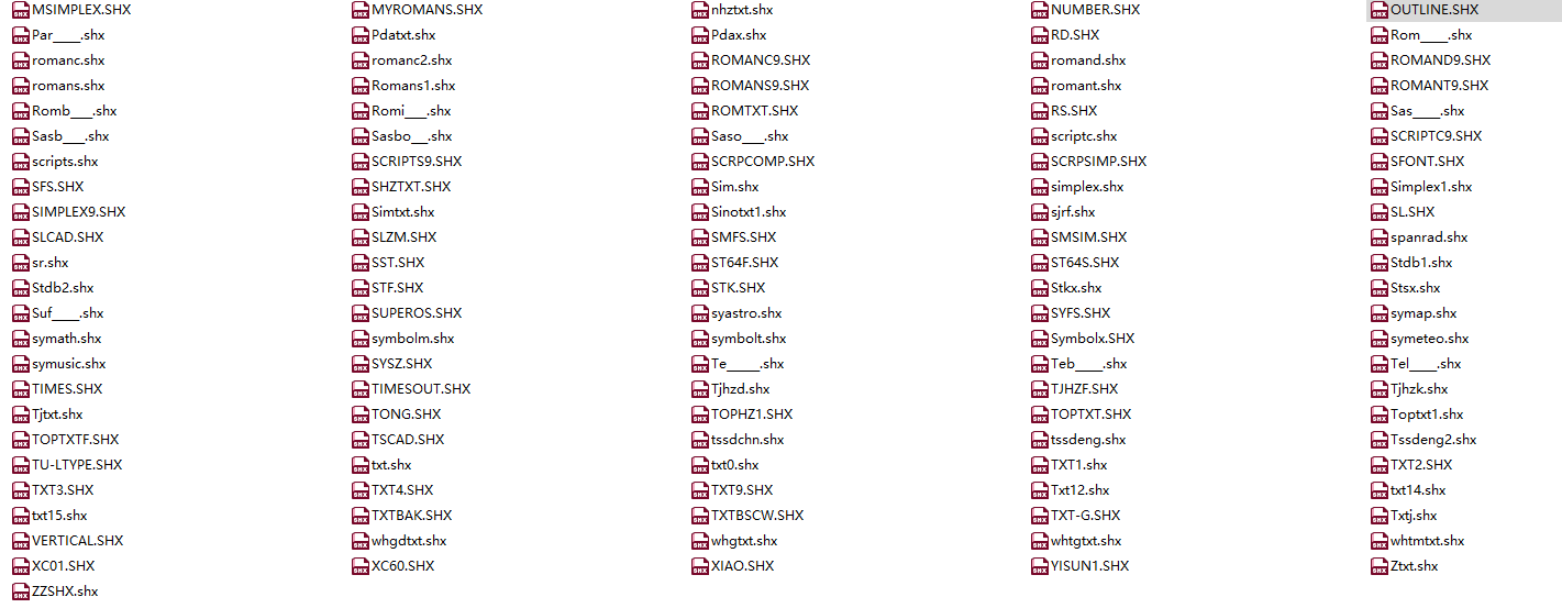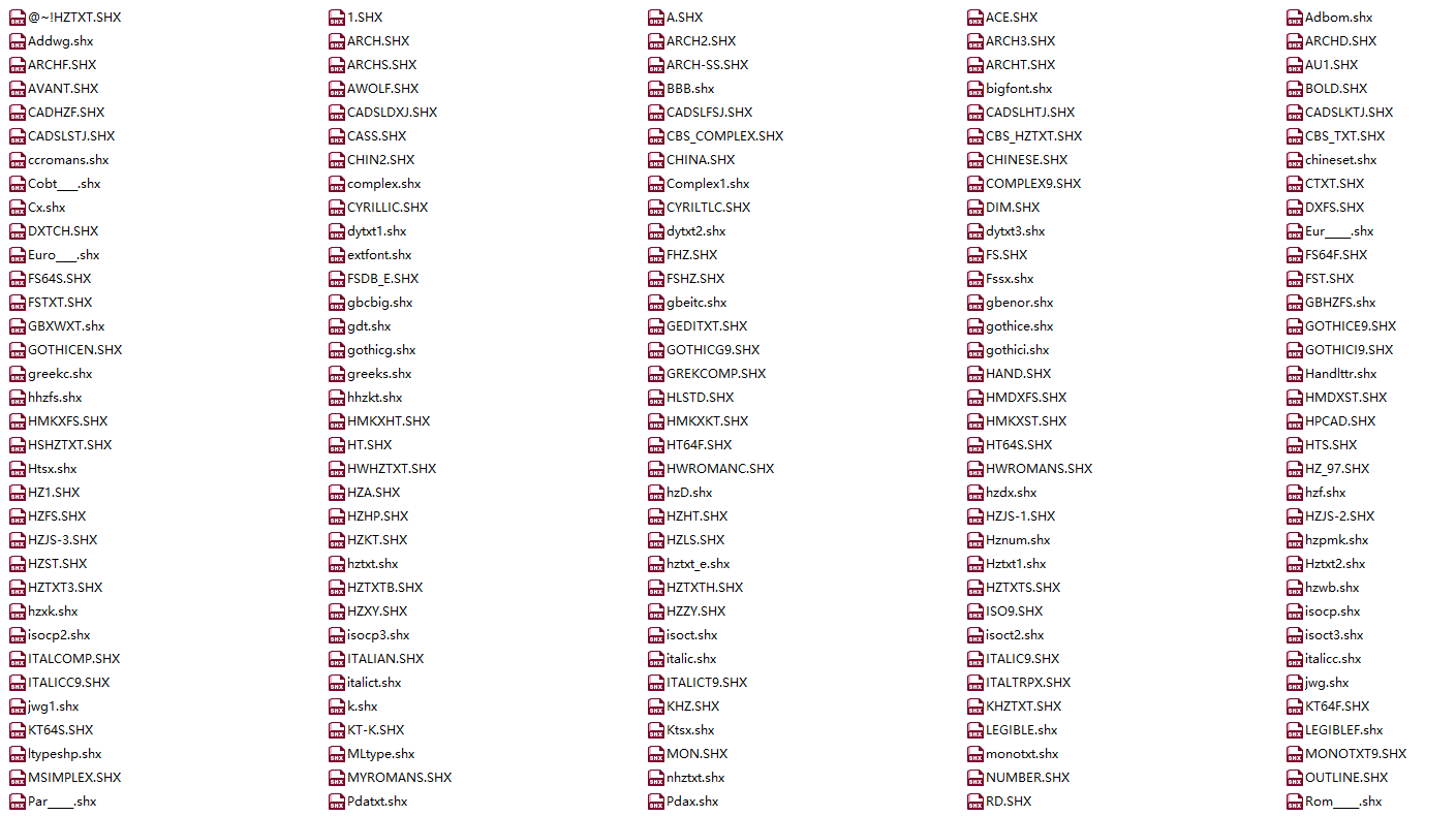 均为shx格式,这些字体主要作用就是方便建筑工程人员查看图纸。如果系统中缺少了某个cad字体的话将导致图纸无法正常打开查阅,如出现乱码等现象。